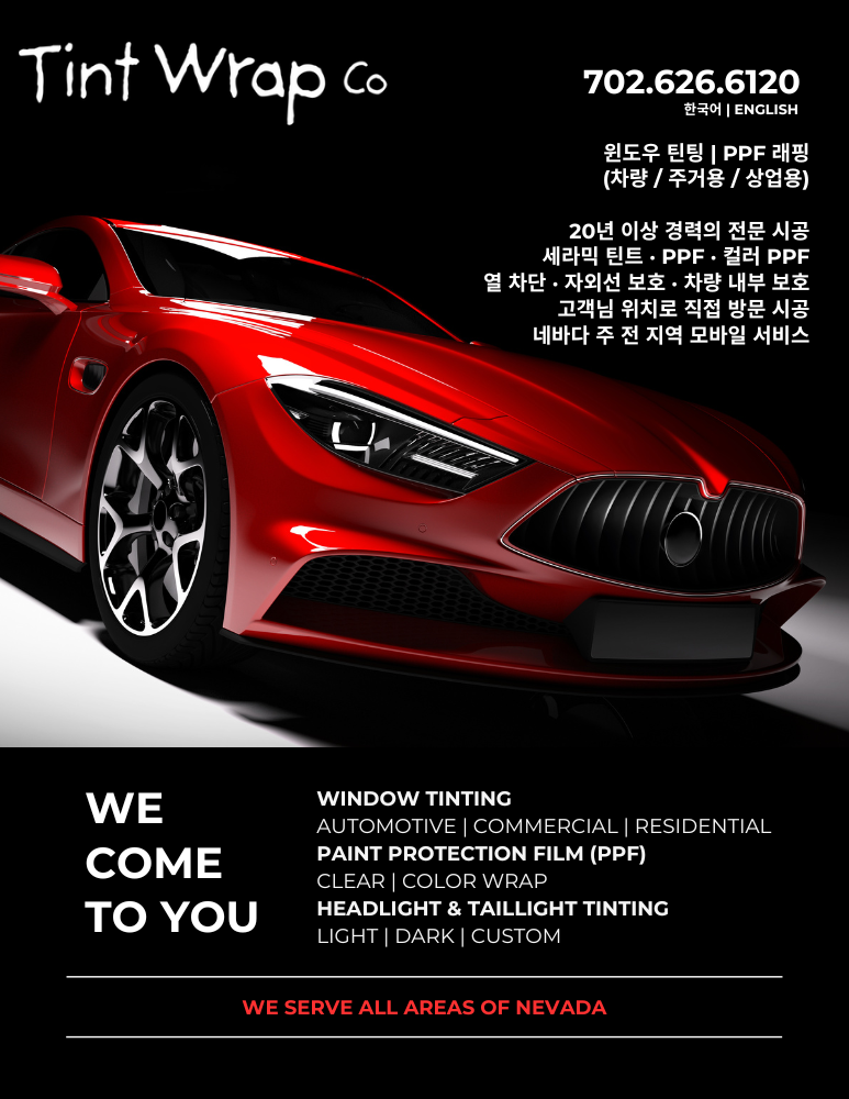 네바다 전 지역에서 모바일 윈도우 틴팅 & PPF 래핑 서비스를 제공하는 Tint Wrap Co. 입니다.