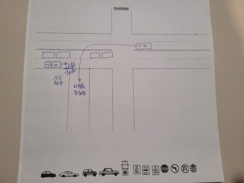 맞은편 직진하는 차가 제 차 뒷편을 쿵하고 받았습니다.