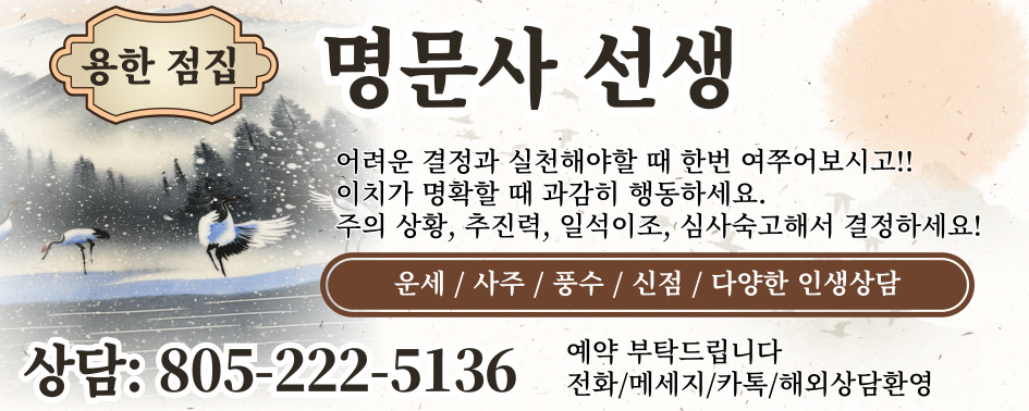 명문사 선생-운세 / 사주 / 풍수 / 신점 / 다양한 인생상담 jhlee 0 433 2025.09.11 12:37 명문사 선생어려운 결정과 실천해야할 때 한번 여쭈어보시고!!이치가 명확할 때 과감히 행동하세요.주의 상황, 추진력, 일석이조, 심사숙고해서 결정하세요!운세 / 사주 / 풍수 / 신점 / 다양한 인생상담상담: 805-222-5136전화/메세지/카톡/해외상담환영, 예약 부탁드립니다.