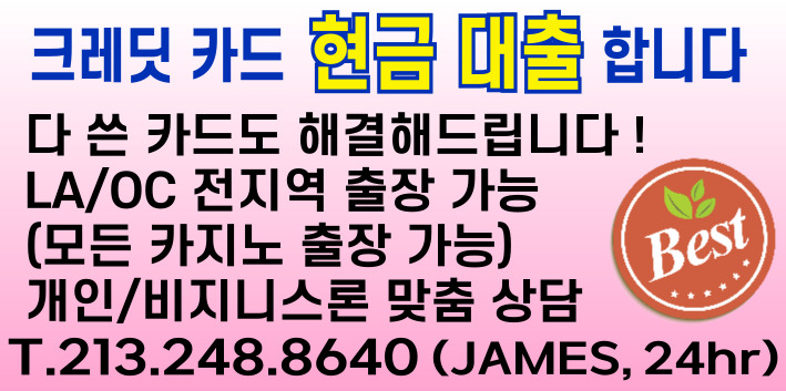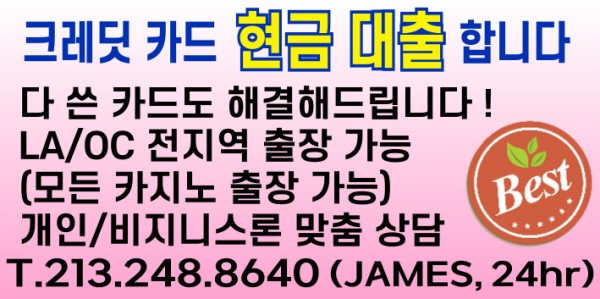 크레딧 카드 현금대출 합니다 jhlee 0 330 2025.09.05 12:26 크레딧 카드 현금대출 합니다다 쓴 카드도 해결해드립니다LA/OC전지역 출장가능(모든 카지노 출장가능)개인/비지니스론 맞춤 상담타주에서 대출을 위해 방문하실 분도 상담 환영합니다213-248-8640 James 24hr