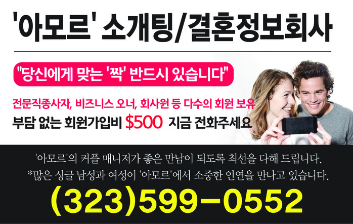 아모르 소개팅/결혼정보회사 jhlee 0 433 2025.08.28 12:50 아모르 소개팅/결혼정보회사당신에게 맞는 '짝' 반드시 있습니다. 전문직종사자, 비지니스오너, 회사원등 다수의 회원 보유부담 없는 회원가입비 $500 지금 전화주세요.'아모르'의 커플 매니저가 좋은 만남이 되도록 최선을 다해 드립니다. 많은 싱글 남성과 여성이 '아모르'에서 소중한 인연을 만나고 있습니다. 323-599-0552