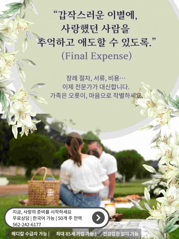 아름다운 마지막 사랑의 표현 장례보험 (Final Expense)로 준비 하세요.
