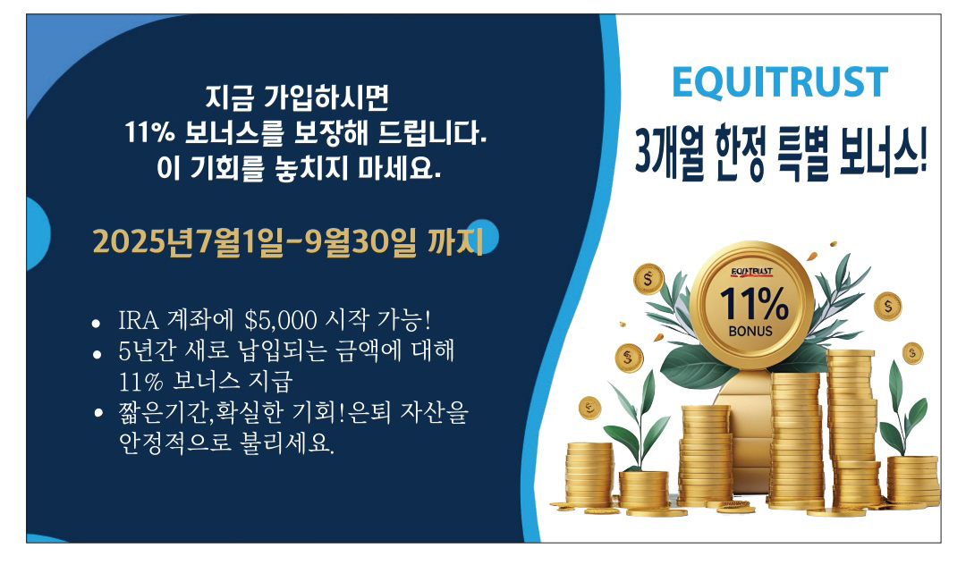 IRA 11% 보너스 상품 ROGG 0 688 2025.07.29 12:05 지금 가입 하시면 11% 보너스를 보장해 드립니다.IRA 등 연금 상품의 보너스가 높게 나온 상품이 있어서 연락드립니다. 11% 보너스가 5년동안 원금에 추가 되고, 합쳐진 금액에 이자가 붙는 형태입니다.은퇴 준비와 Tax 절세에 도움이 됩니다.BridgeOne InsuranceBang, Jung Hwan, Manager702-763-2670