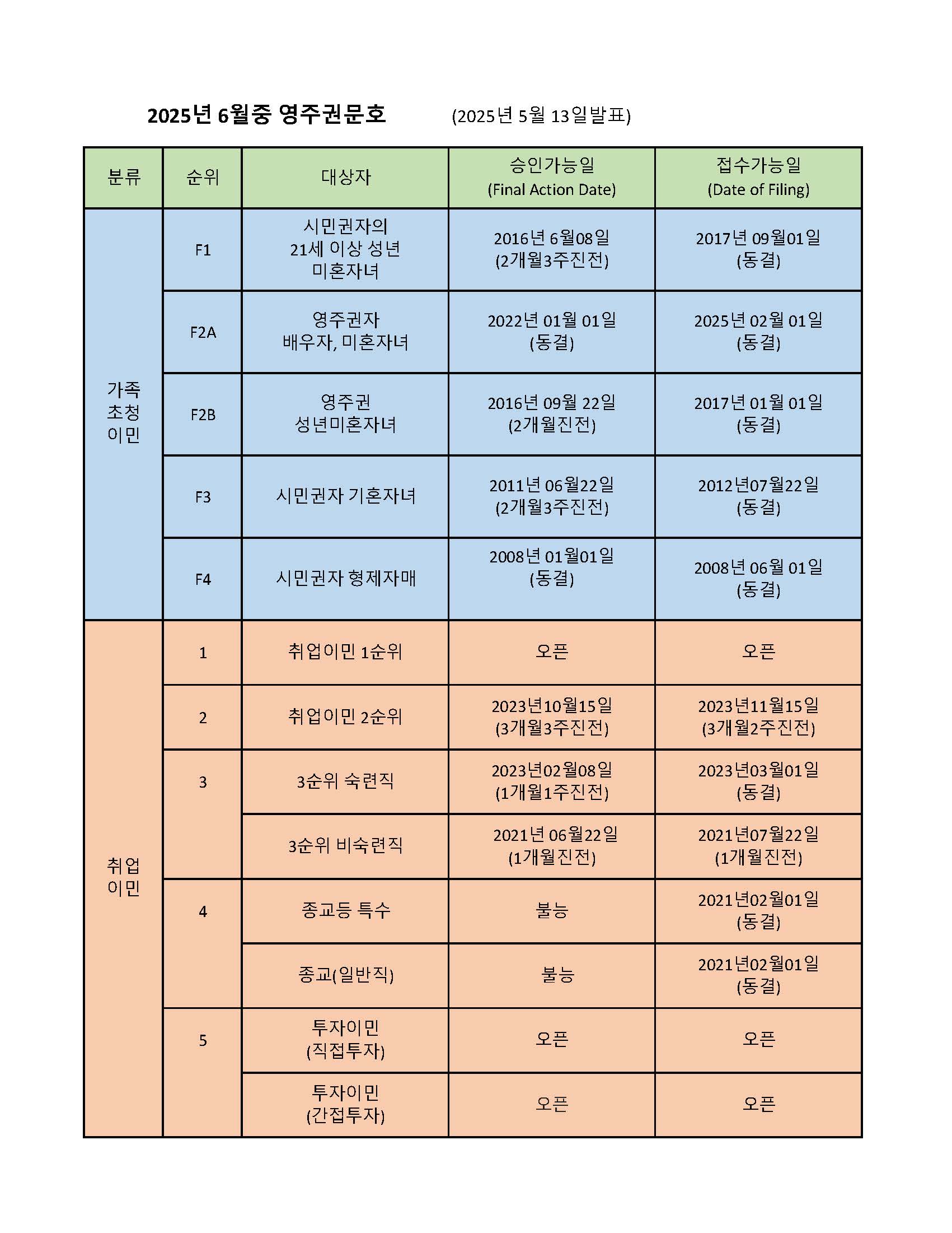미국 국무부(DOS)는 5월 13일 2025년 6월중 영주권문호(Visa Bulletin)를 발표했습니다. 6월 영주권문호에서는 가족이민은 승인가능일(Final Action Date)에서 시민권자21세이상미혼자녀(F1),영주권자21세이상미혼자녀(F2B),시민권자기혼자녀(F3)가 2개월에서 2개월3주 진전 되었으며 접수가능일(Filing Date)은 모두 진전없이 동결 되었습니다.