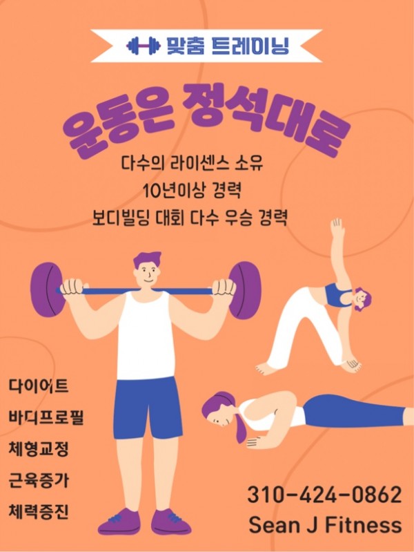 10년의 펄스널 트레이닝의 경험을 토대로 운동/PT를 전문적이고 체계적으로 도와드리고 있는 자격증 NASM & ISSA & ACTION certified personal trainer, Sean이라고 합니다.