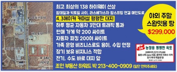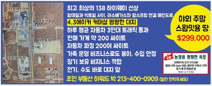 야외 주말 스왑밋 용 땅 매매 S파크 0 65 04.08 20:52 야외 주말 스왑밋 용 땅 매매최고 최상의 138 하이웨이 선상4,3에이커 커머셜 평평한 대지하루 평균 자동차 3만대 트래픽 통과캘리포니아 팜데일과 빅토빌 사이, 라스베가스와 팜스프링 연결 메인도로판매 가게 약 200 싸이트, 자동차 파킹 200여 싸이트가족 운영 비즈니스 로도 용이 수입 안정장기 보유 비지니스 적합전기, 수도 바로 대지 앞 가$299,000조인 부동산 하워드 박 213-400-0909일단 연락 주세요