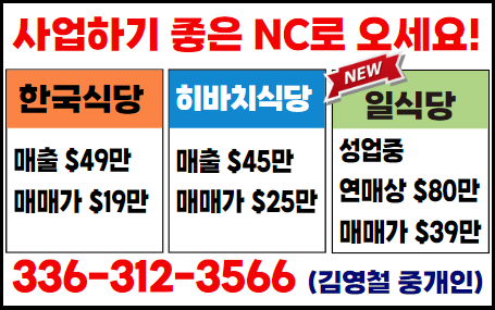 사업하기 좋은 노스캐롤라이나 식당매매