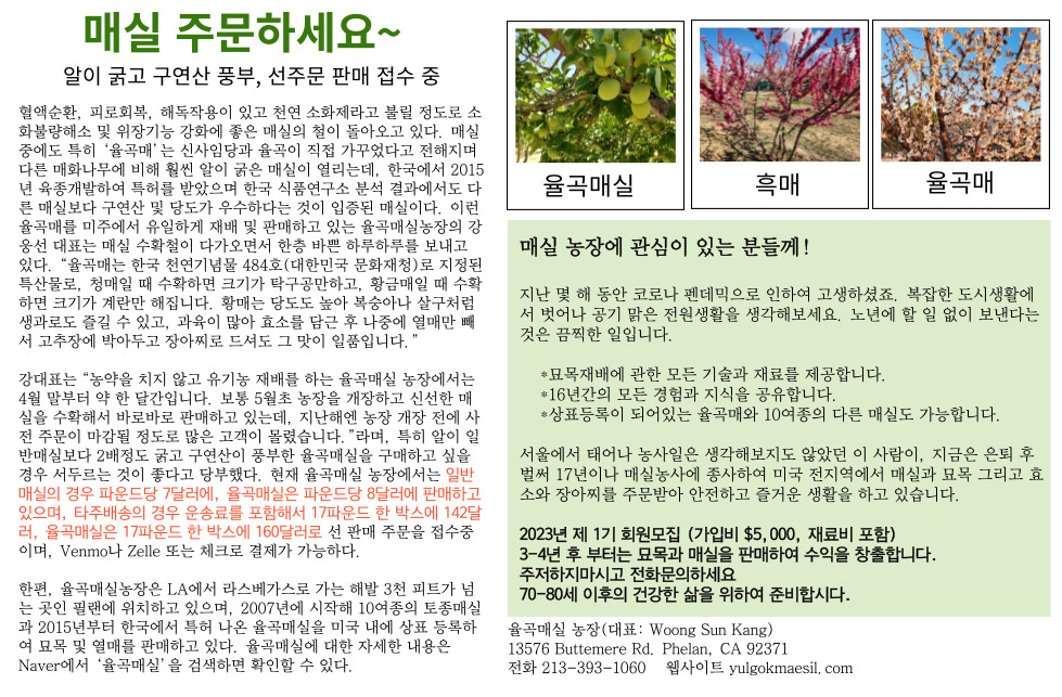 매실 주문하세요 sulee 0 337 2023.02.22 14:38 매실 주문하세요율곡매실은 일반매실보다 2배정도 크다.타주주문 17lb(우송료포함) 율곡매실 $160, 일반매실 $142, 매실효소 1갤런 $130구글이나 네이버에서 율곡매실 참조율곡매실농장 13576 Buttemere Rd. Phelan, CA 92371213-393-1060
