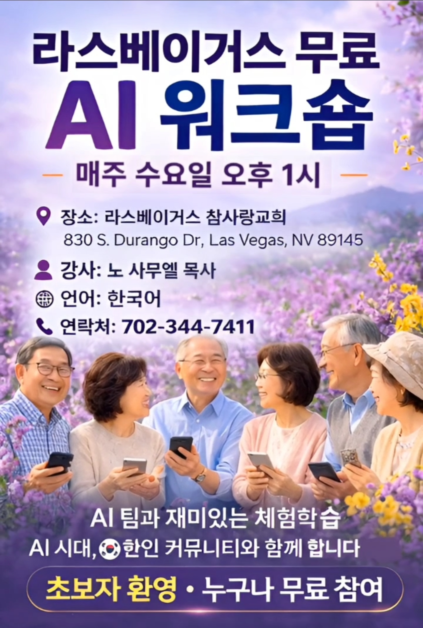 특강 Ai 워크삽 4/15(수) 오후 1시 viva 0 109 04.11 00:15 무료 특강 Ai 워크삽이 오는 4월15일 수요일부터 개강합니다. (매주 수요일 1시)언어장벽과 문화 차이로 벅찬 이민생활 속에 알아두면 편리한 Ai 쳇봇 활용을 배우시고 오셔서 즐겁고 유익한 시간 되기를 바랍니다.재외교민 누구나 무료로 참여하실 수 있습니다.장소: 라스베가스 참사랑교회 830 S. Durango Dr.