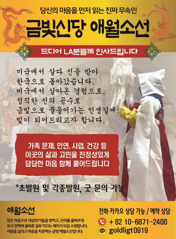 당신의 마음을 먼저 읽는 진짜 무속인 " 금빛신당 애월소선 " S파크 0 255 2025.12.02 13:46 당신의 마음을 먼저 읽는 진짜 무속인" 금빛신당 애월소선 " 드디어 미주 한인분들께 인사드립니다.미국에서 살다 신을 받아 한국으로 돌아갔습니다.미국에서 살아온 경험으로, 정직한 신의 공수로금빛으로 물들어가는 인생길에 빛이 되어드리고자 합니다.가족 문제, 인연, 사업, 건강 등이곳의 삶과 고민을 진정성있게답답한 마음 함께 풀어드립니다*초발원 및 각종발원, 굿 가능전화·카카오 상담 가능 / 예약 상담상담전화 : (82)10-6871-2400카톡ID : goldligt0919