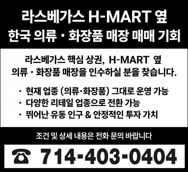 H-mart 옆 한국 옷가게 급매매 Tammy 0 8 11.15 22:47 베가스 최고의 로케이션 H-mart 옆 한국 옷 & 화장품 가게 인수 하실 분을 찾습니다. 남편 이직으로 부득이하게 양도 원합니다. 다른 리테일샵 관심 있으신 분들도 환영합니다. 가게 내에 서브리스 할 룸 여러 개 있고요. 여러 가지 가능성이 무궁무진한 가게입니다. 자세한 내용은 문의 전화 부탁 드립니다. 714-403-0404