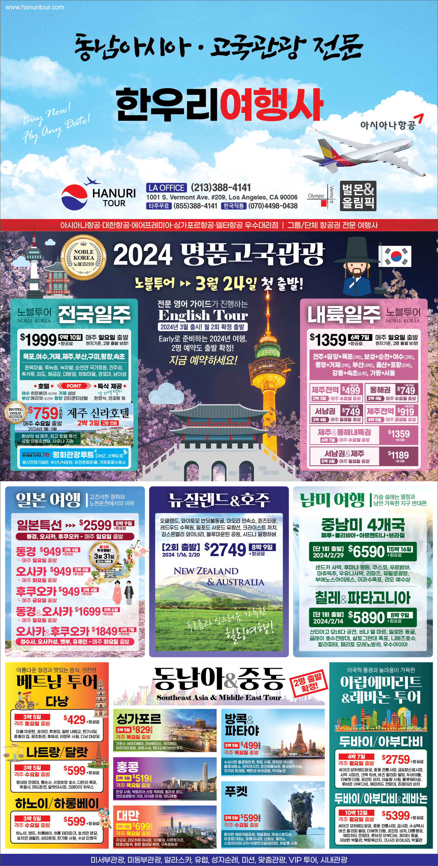 한국및 전 세계 항공(관광)특가 한우리여행사(213-388-4141)-최우수 공인 대리점