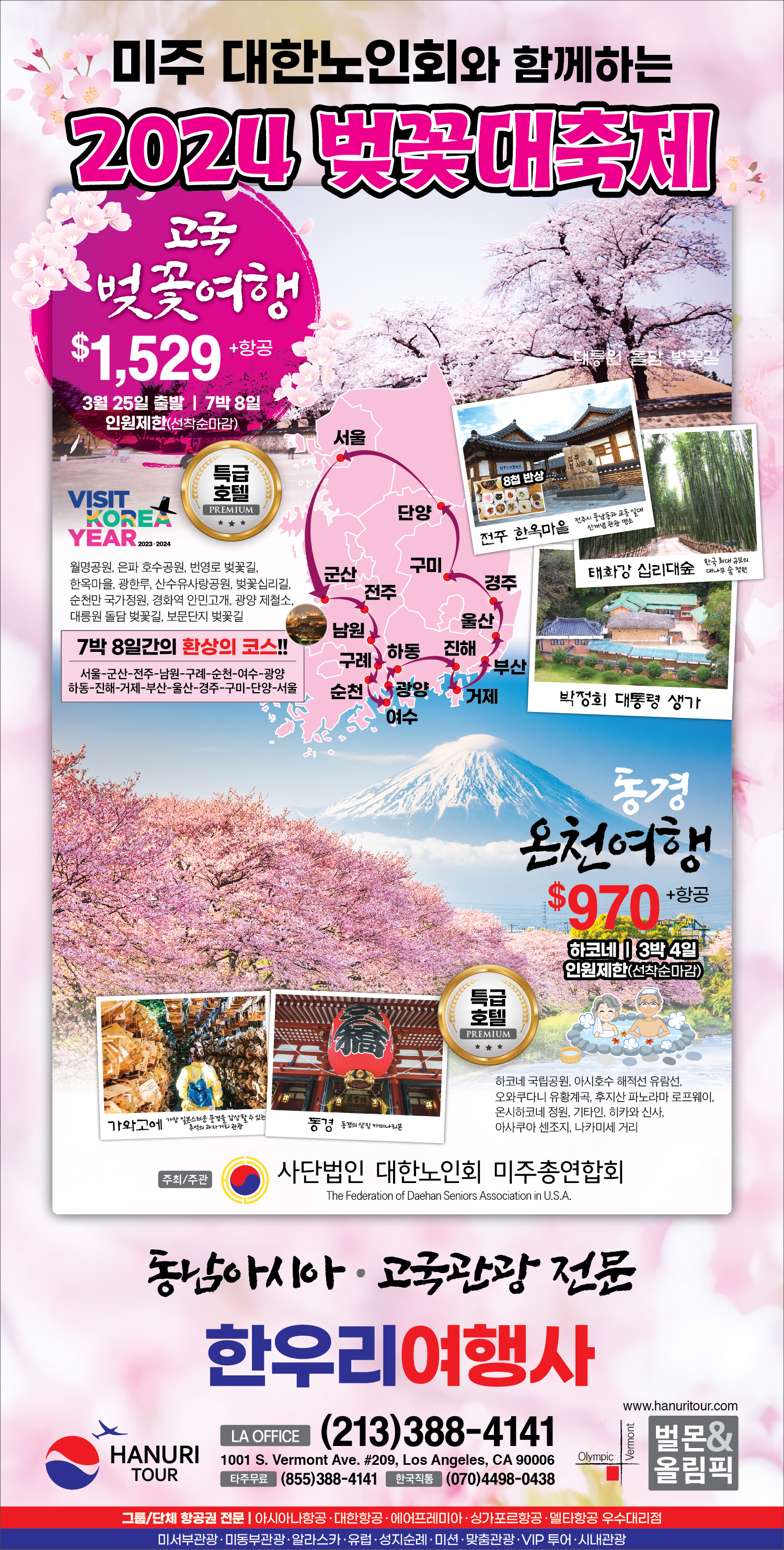 미주 대한노인회와 3월 한국및일본 벚꽃 축제(213-388-4141)