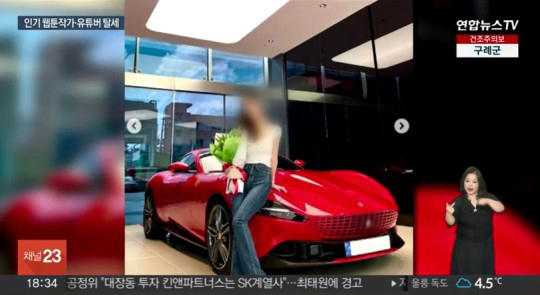 뉴스 보도와 함께 자료화면에 등장한 사진에는 한 여성이 빨간색 슈퍼카 앞에서 포즈를 취하고 있다. 이 여성의 모습은 모자이크 됐지만 웹툰작가 야옹이가 개인계정에 올린 사진이라는 것을 알 수 있었다.