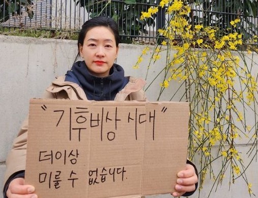 공개된 사진 속에는 1월에 핀 개나리 앞에서 ‘기후 비상 시대 더 이상 미룰 수 없습니다’라는 문구가 적힌 피켓을 들고 있는 박진희의 모습이 담겨 있다.