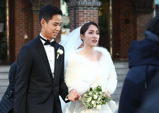 여자 골프 세계랭킹 1위 리디아 고와 정태영 현대카드 부회장의 아들 정준 씨가 30일 서울 중구 명동성당에서 결혼식장으로 향하고 있다. 뉴스1