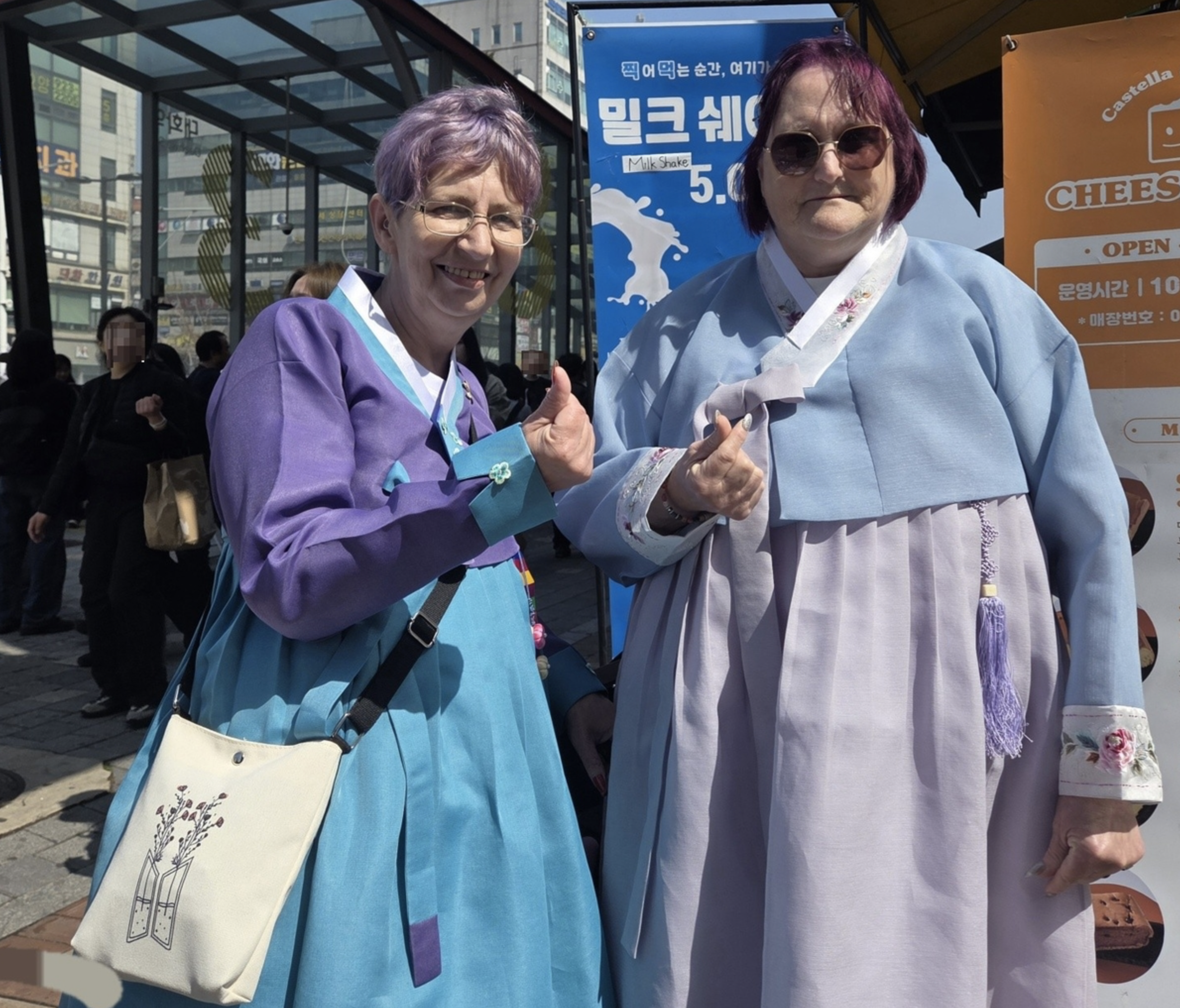 멀리 영국에서 지인 잰과 함께 방탄소년단을 보러 한국을 찾았다는 그는 방탄소년단을 상징하는 보랏빛 한복을 곱게 차려입고 머리도 보라색으로 물들였다.