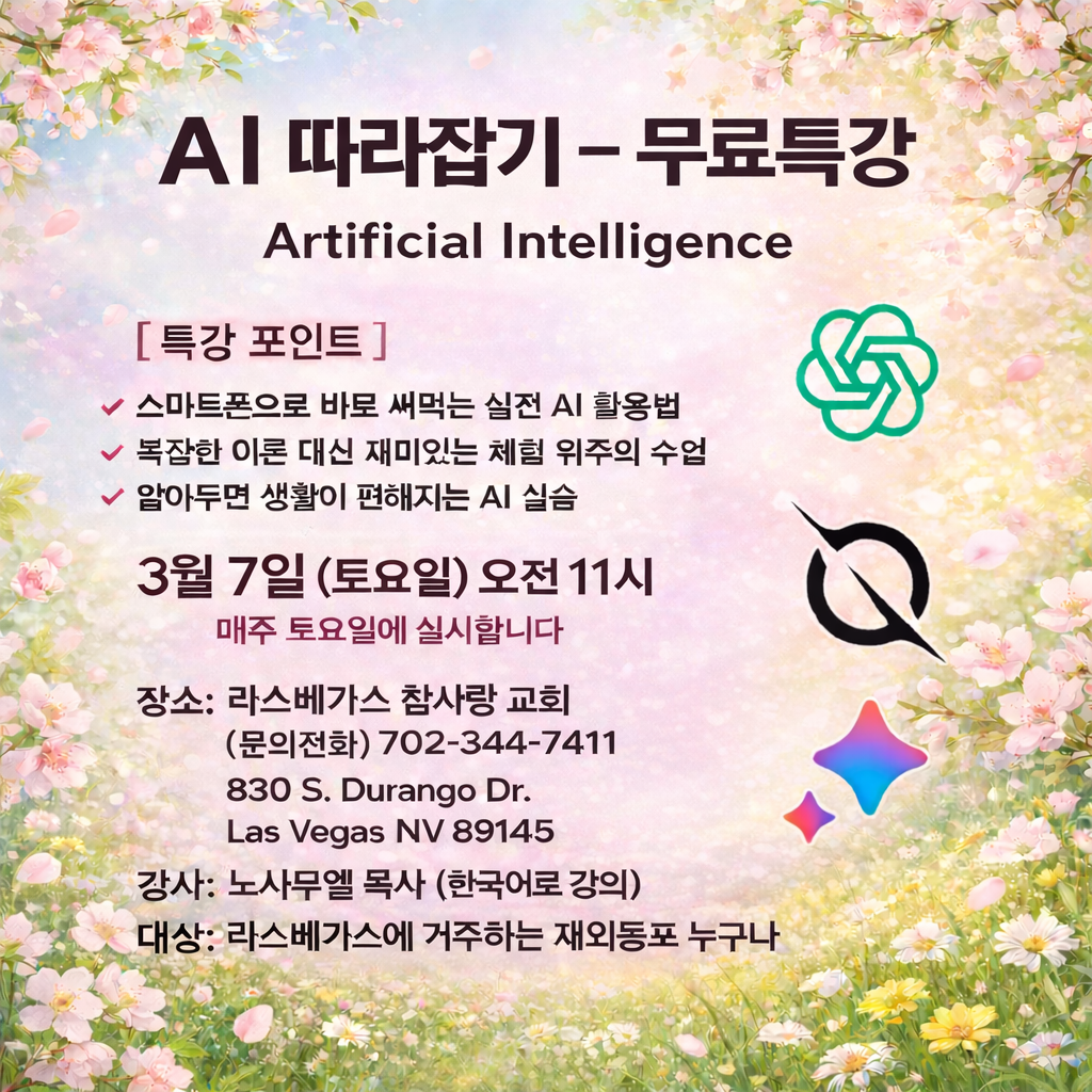 제2차 Ai 특강이 3월7일부터 매주 토요일마다 실시 viva 0 176 03.05 08:40 오는 토요일(3월7일)부터 제2차 Ai 특강이 매주 토요일마다 실시합니다.이번 토요강의에는 1) 사진 갤러리 Ai 기능과 영화 만들기 기능을 알아보고 2) 그록으로 증명사진 만들기와 영상 만들기 3) 대화형 Ai 와 노트앱 연동 활용법, 4) Ai사용시 필수 주의 사항 그외 여러 유익한 실전 기능 사용법 등을 알려드립니다.장소는 참사랑 교회 토요일 오전 11시 시작입니다.830 S. Durango Dr. Las Vegas.