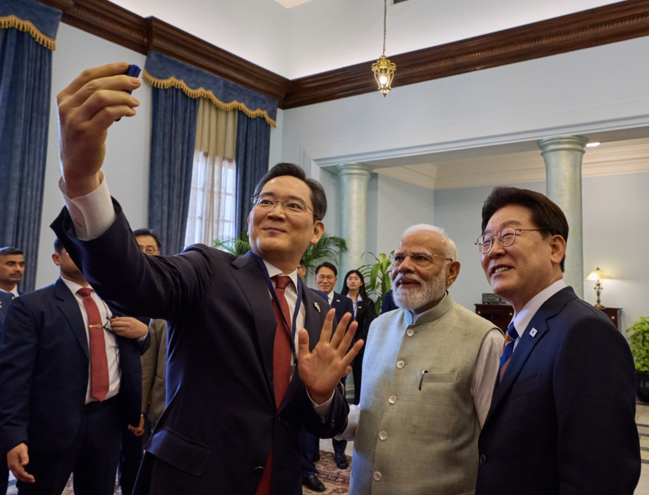 李대통령·모디·이재용, 깜짝 셀카…인도서 만든 갤럭시폰 활용