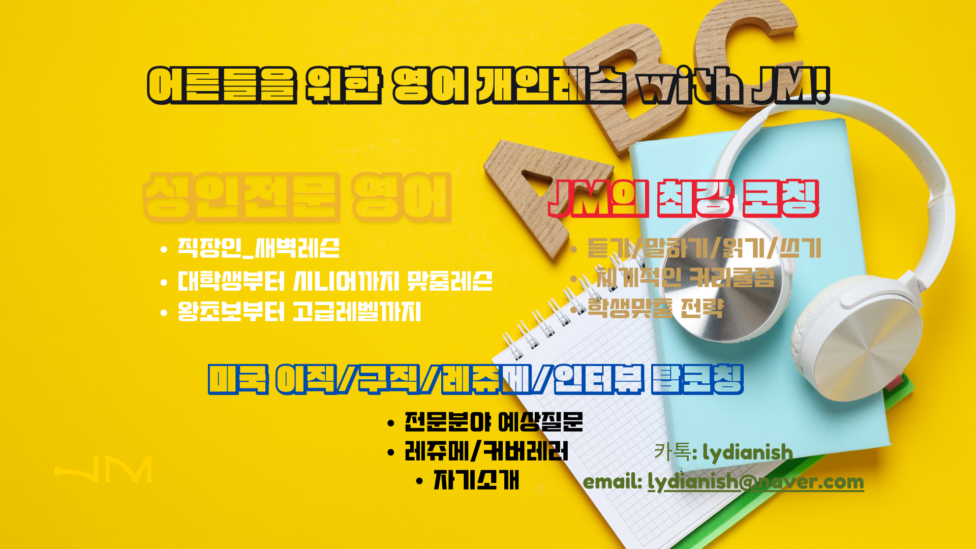 #어른들을위한영어 #영어개인레슨 #영어회화 #영어말하기 #1대1영어수업 #영어코칭 #JM영어 #영어무료체험 #화상영어수업 #성인영어 #영어듣기훈련 #영어스피킹 #미국이직 #영어레쥬메 #영어인터뷰 #AdultEnglish #SpeakEnglishFluently #EnglishCoaching #PrivateEnglishLesson #EnglishForAdults #ESLLesson #OnlineEnglishTutor #1on1EnglishClass