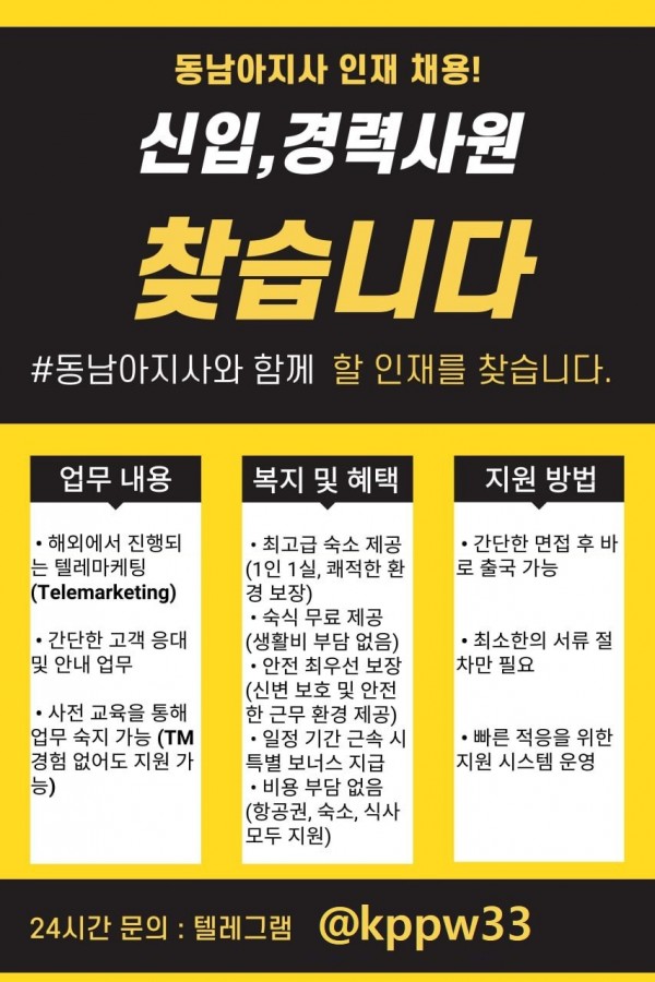 동남아지사에서 해외티엠 정규직 모집합니다(텔레 kppw33) 해외취업 해외구인구직 해외일자리
