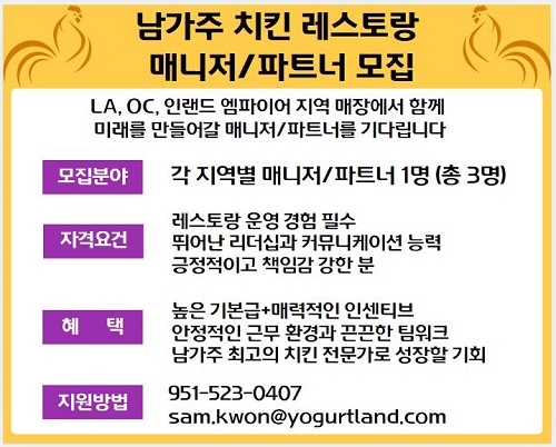 남가주 치킨 레스토랑 매니저/파트너 모집