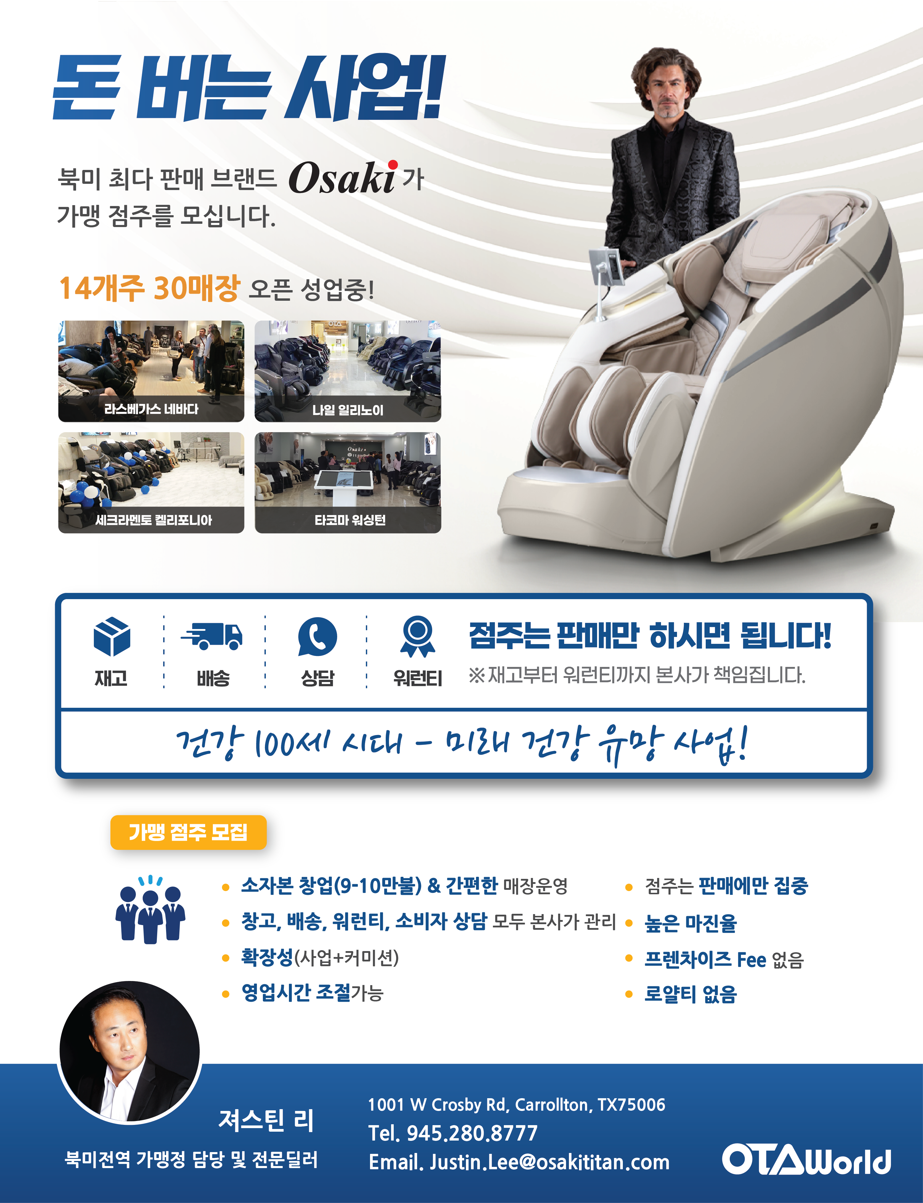손님에게 안마의자 체험의 기회를 주며, 자연스럽게 판매로 연결되도록 하는 방식의 OTA World 프랜차이즈 사업은 현재 전미주 15개주에 30개의 체험매장을 오픈하였으며, 올해 안에 5개 이상의 추가매장이 오픈될 예정입니다.