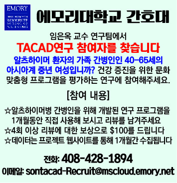 에모리대학교 간호대 임은옥 교수 연구팀에서 TACAD연구 참여자를 찾습니다