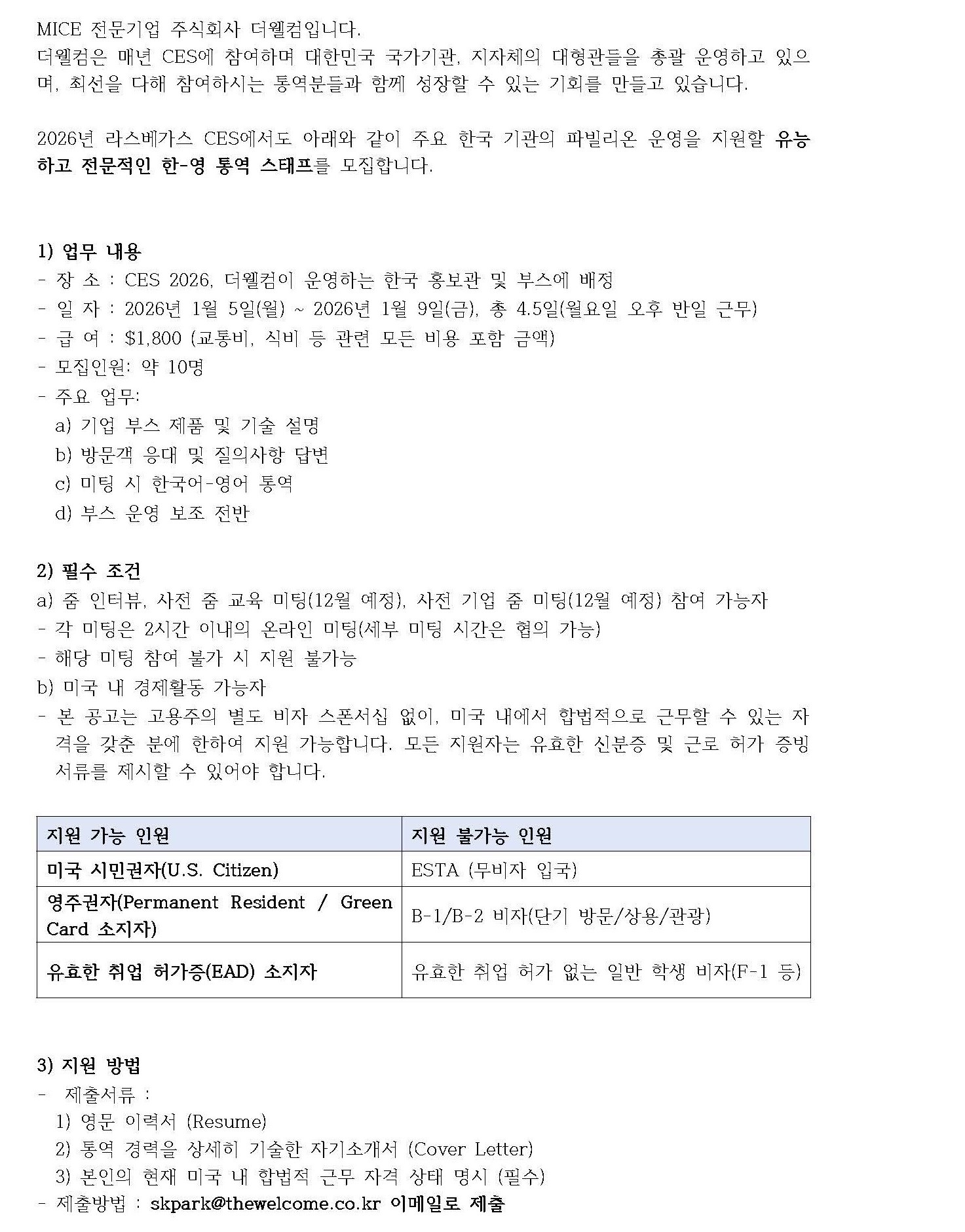 주식회사 더웰컴 ‘CES 2026 현장 통역’ 모집 공고
