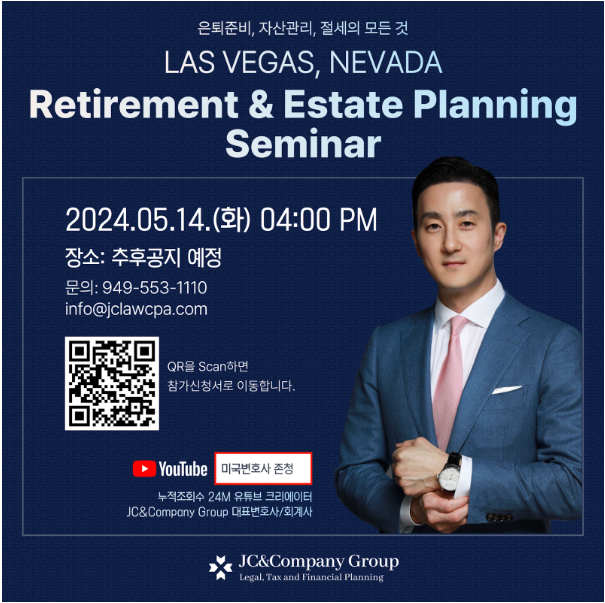 2024년 5월 14일 화요일, 미국변호사 존청과 JC&Company 전문가팀이 베가스 교민, 기업을 위한 꼭 알아둬야 할 은퇴, 자산관리, 절세, 투자전략 세미나를 개최합니다.