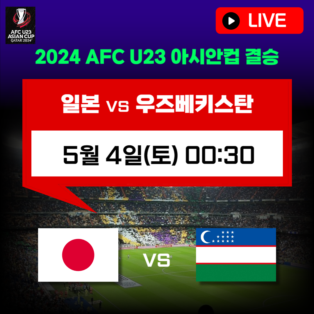 AFC U23 아시안컵 결승전 일본 우즈베키스탄 축구 중계 방송 2024년 5월 4일 경기 일정 AFC U23 아시아컵도 이제 한 경기만 남았습니다. 바로 결승전이죠. U23 아시안컵 결승전 경기일정 : 2024년 5월 4일(토) 00:30(한국시간)