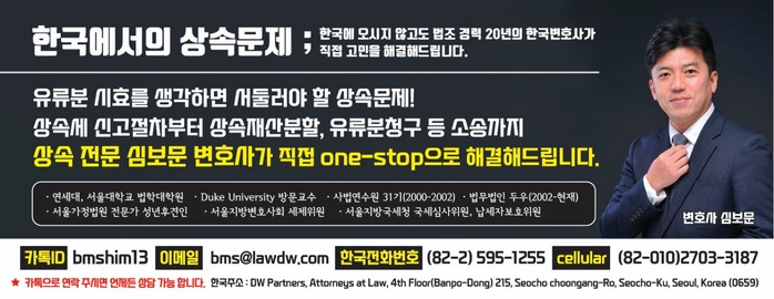 한국의 상속문제 고민해결 jhlee 0 636 2024.04.09 15:06 한국의 상속문제 고민해결법조 경력 20년의 전문서울 강남 로펌 한국 심보문변호사가 도와 드립니다.문의: 82-10-2703-3187 / 카톡ID: bmshim13 으로 상담 가능합니다