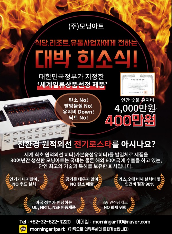식당창업 준비중이신 사장님의 필수템-모닝아트 전기로스타를 아시나요? jhlee 0 713 2024.03.06 11:38 (주)모닝아트- 친환경 원적외선 전기로스타를 아시나요?식당, 리조트, 유통사업자에게 전하는대박 희소식!대한민국정부가 지정한 세계일류상품선정 제품탄소 No발암물질 No유지비 Down닥트 No연간숯불유지비 4,000만원-----> 전기로스타 사용 시 400만원으로 유지비 다운문의전화: 82-32-822-9220이메일: morningart10@naver.com(카톡으로 연락주시면 빠른 전화상담이 가능합니다)카톡ID: morningartpark