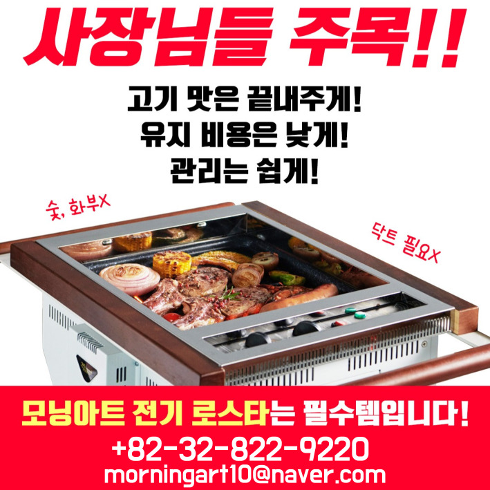 친환경 원적외선 전기로스타를 아시나요? jhlee 0 510 2024.02.27 15:24 (주)모닝아트- 친환경 원적외선 전기로스타를 아시나요?식당, 리조트, 유통사업자에게 전하는대박 희소식!대한민국정부가 지정한 세계일류상품선정 제품탄소 No발암물질 No유지비 Down닥트 No연간숯불유지비 4,000만원-----> 전기로스타 사용 시 400만원으로 유지비 다운문의전화: 82-32-822-9220이메일: morningart10@naver.com