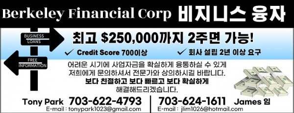 비지니스융자가 필요하신가요? jhlee 0 642 2024.02.08 13:56 Berkeley Financial Corp. 비지니스융자 최고 $250,000까지 2주면 가능! (Credit Score 700이상, 회사 설립 2년 이상 요구) 보다 친절하고, 보다 빠르고, 보다 확실하게 해결해드리겠습니다703-622-4793tonypark1023@gmail.com703-624-1611jlim1026@hotmail.com