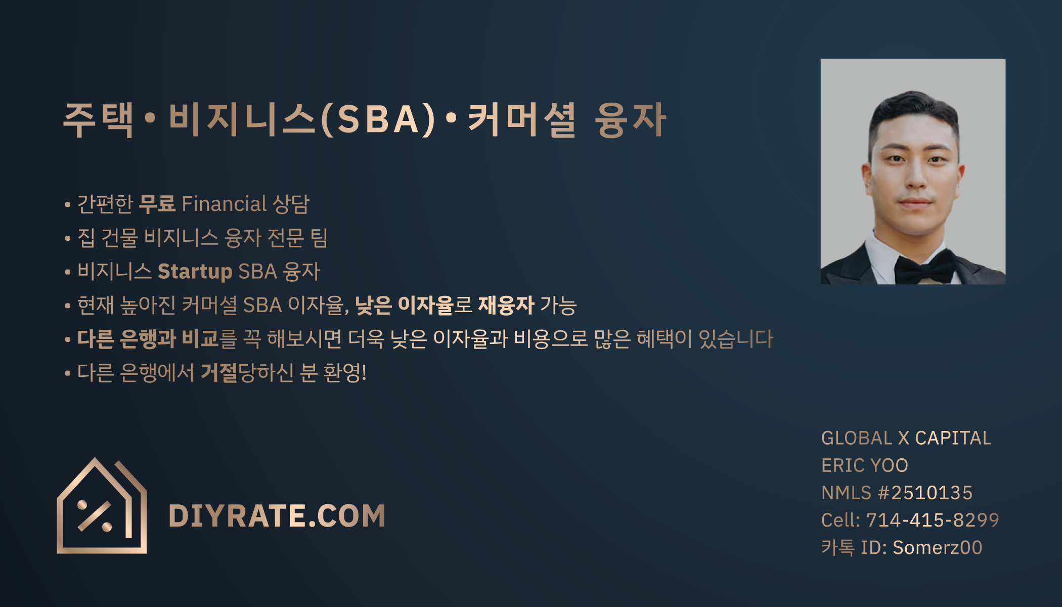 ✔️ 주택, 상가, 건물, 비즈니스 융자 및 SBA 융자가 필요하신 분들, 저희와 함께하세요! ✔️ 새로운 융자나 재융자가 필요하신 분들, 다양한 옵션을 비교하고 싶으신 분들은 연락 주세요.