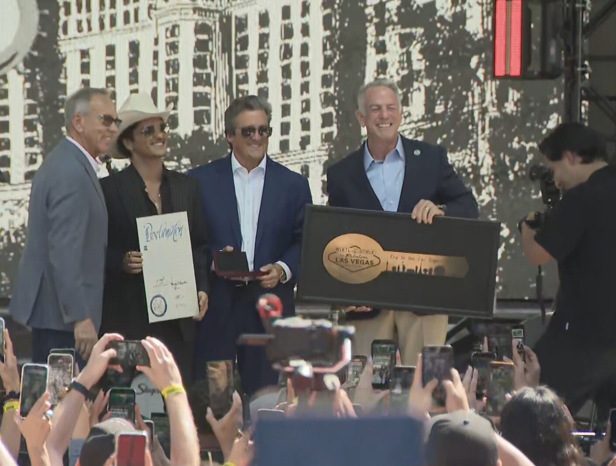 라스베이거스 스트립에서 뮤직 스타 브루노 마스를 기리는 대규모 축하 행사가 열렸으며, 마스 본인도 직접 깜짝 발표를 했다.